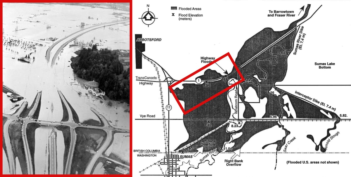 Near Everson, Wash., about 10km south of the Canada/US border, water spilled across a farmer’s fields and began flowing downhill and to the north. The water flowed through Everson, inundated the small town of Sumas, Wash., then crossed over the border into the western part of Sumas Prairie.