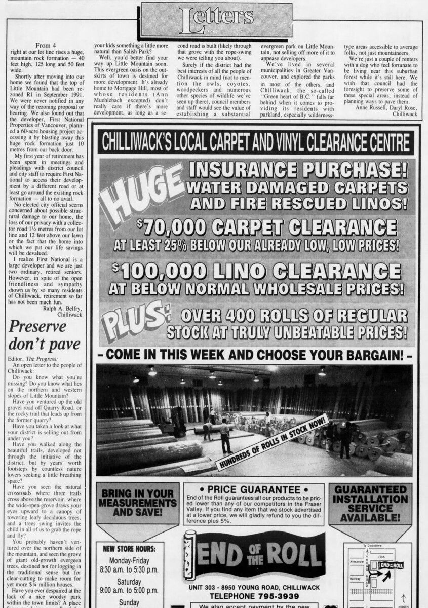 The Chilliwack Progress archives don’t have a record of those statements from Les. However, it does include a number of stories from the June 1993 public hearing. At that hearing, the developer First National Properties shared its plan to create at least 128 units of “cluster housing” on the property. More than 200 residents crammed into Chilliwack’s council chambers to speak about the proposal. Most of those residents sided with Russell and the Friends of Little Mountain.