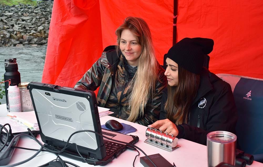 Of course, it’s not all about clicking a counter. “It’s quite cute, sometimes we see some really big fat ones that we cheer for,” Dutt said, laughing a little. But the women also head out twice a day to conduct “creel surveys”—a qualitative study of the number and type of fish anglers have caught downstream of the sonar beam.