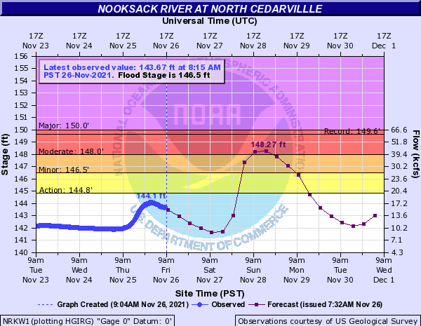 The forecasting models suggest that the river will likely rise as the result of rain, and near the top of its banks on Friday. Flood stage is at 146.5 feet at North Cedarville, where the river exits the foothills of Mt. Baker south of Everson. On Monday morning, the model predicted water would peak at around 143 feet. At 2pm, the forecast was updated, with the peak predicted to exceed 145 feet. But those predictions come with a sizeable margin of error. And the river is expected to rise again toward the 145 feet level on Sunday.