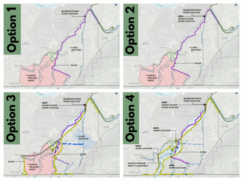 All four options include $32 million to increase the resiliency of Clayburn Village. Plans 2, 3, 4, also include $388 million to bolster the dike protecting Matsqui Prairie.