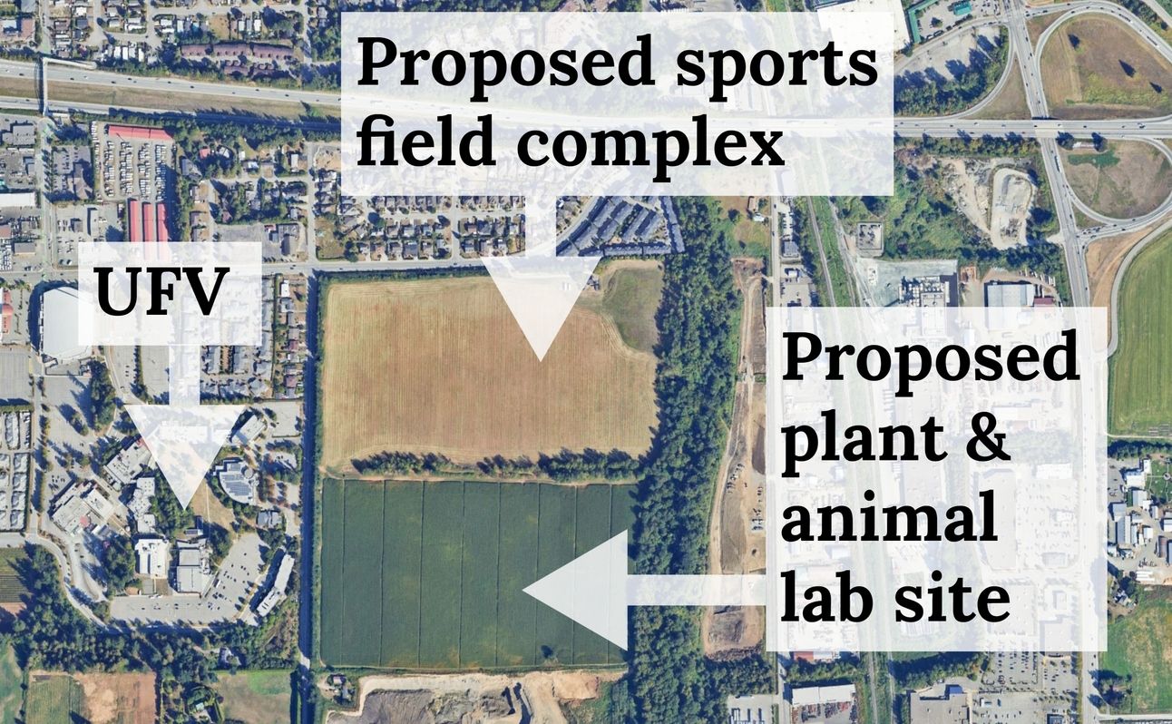 The proposal is linked to the provincial government’s own plans for its new Plant and Animal Health Centre—a lab to replace the facility flooded in 2021. (You can read our recent story on that plan here.) The province wants to split an 86-acre parcel roughly in half and build a new lab on the southern lot. (The property is already largely divided between two fields.) To divide the land and build its lab, the province needs the permission of the Agricultural Land Commission (ALC).