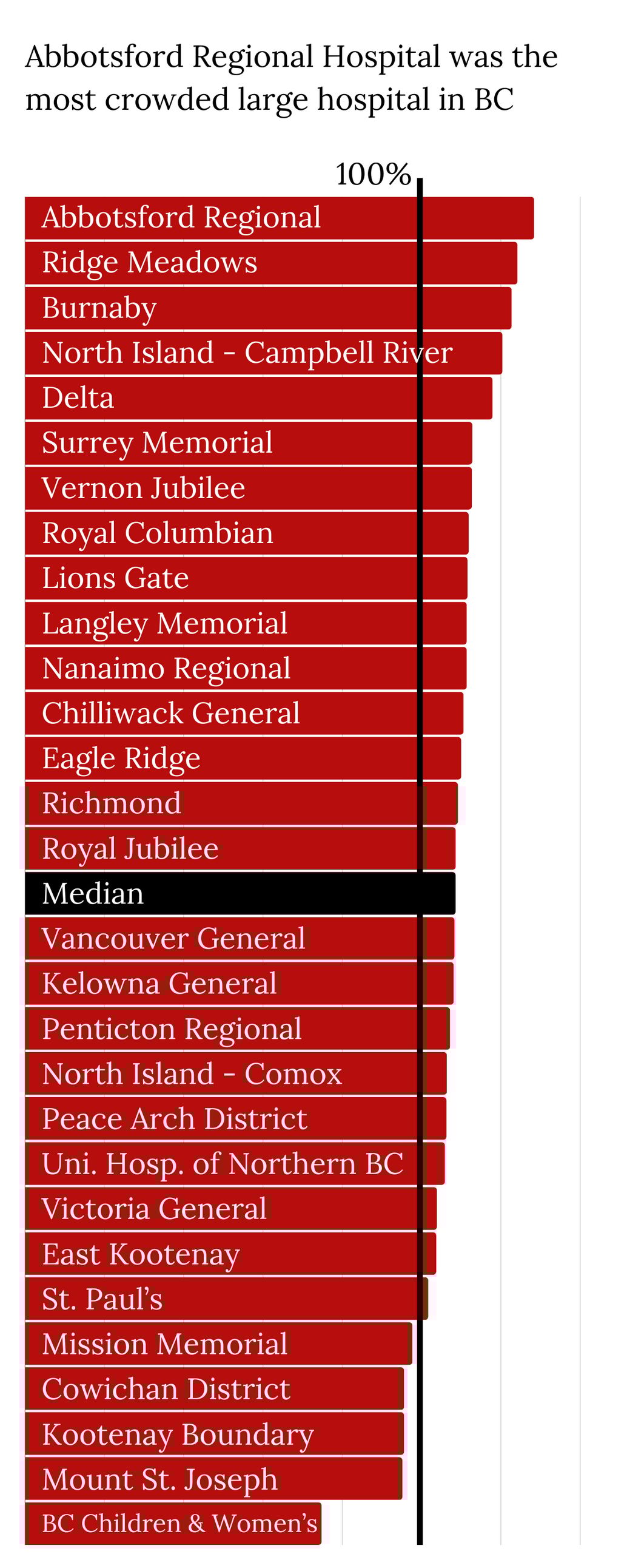 The situation at ARH is extreme, but hardly unique, according to the data obtained by The Current. Two dozen other health care facilities across BC also had occupancy rates above 110%. That group included hospitals in Langley and Chilliwack.