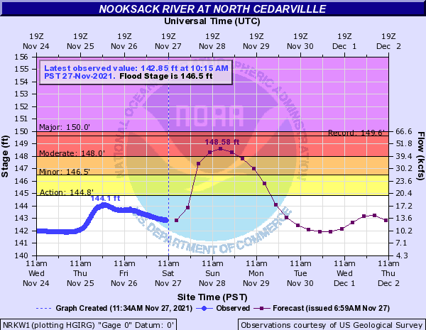 Nooksack watch thread. Let’s watch the Nooksack go up. And hope it doesn’t go up that fast. Here was the forecast this morning: pic.twitter.com/X7WLBx4brk