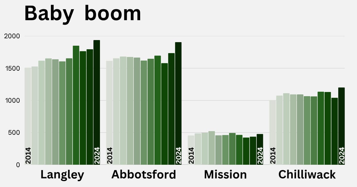 Langley and Abbotsford each registered about 300 more births in 2024 than in 2019. That’s equivalent to about 15 extra kindergarten classes in each city.