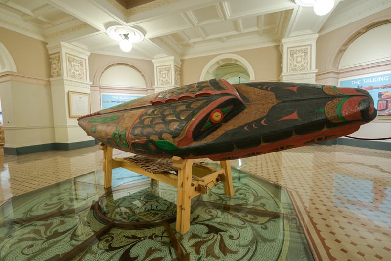 A shovel-nosed-style canoe carved by former Lieutenant Governor Steven Point sits in a rotunda at the BC Legislature. 📷 Legislative Assembly of British Columbia.