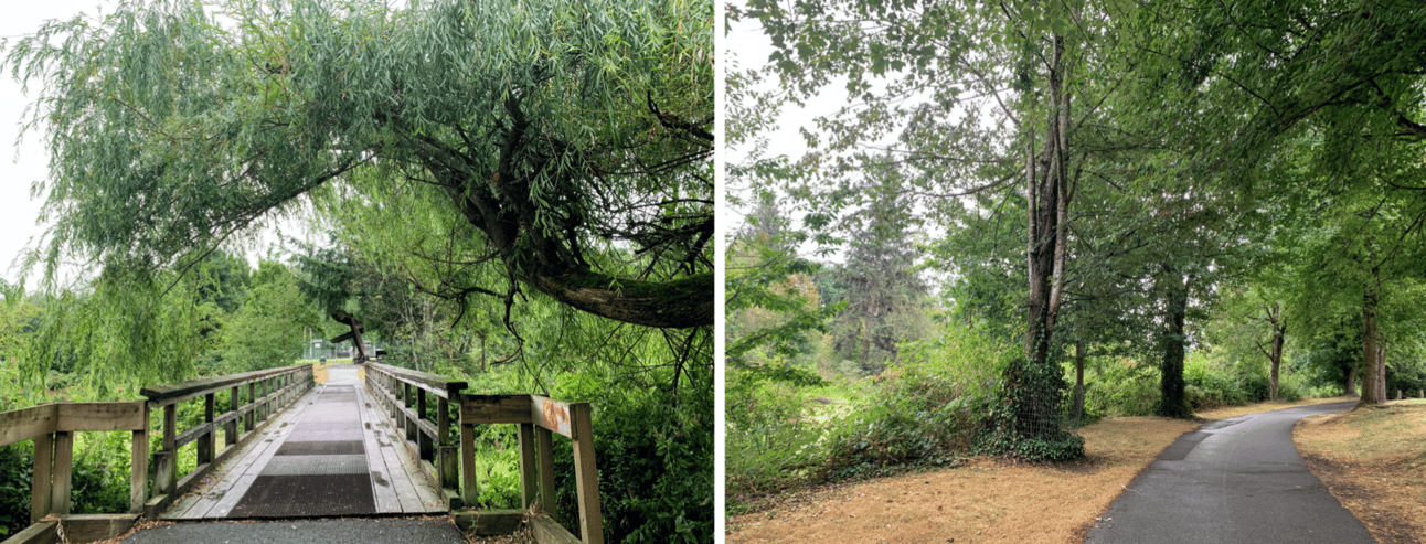 I cross a little wooden bridge and turn back to walk along the other side of the pond. Blackberry bushes heavy with ripening fruit and sharp thorns reach into the path. Willow trees sway above me. The loop I chose to walk is shorter, but more adventurous walkers and runners can connect from these trails onto the Discovery Trail, which leads to Clearbrook Park and, eventually, the Downes Bowl trail system.