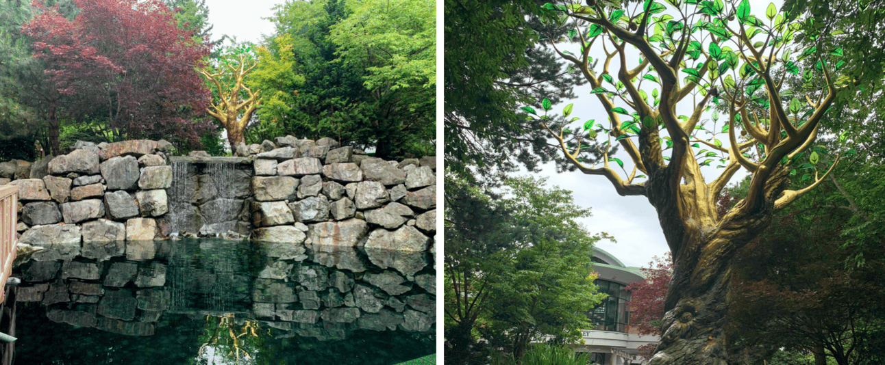 Green glass leaves at the top of the monument blend into the canopy of leaves above and glitter in the sun. It’s a calming place to sit for a while, with a book or a friend or a cup of coffee from nearby, with parking lots and construction fencing out of sight behind the greenery.