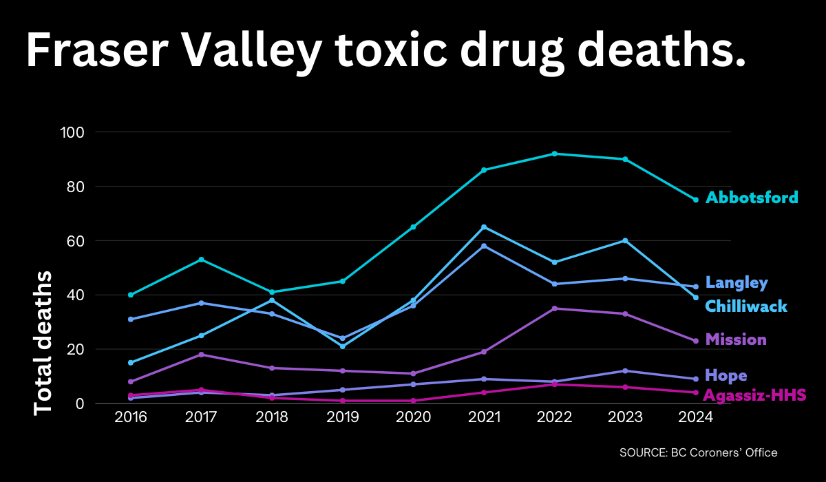 Across BC, deaths because of toxic drugs are declining. In the Fraser Valley, there were around half as many deaths in 2024 than the previous year. (Although there were still almost twice as many fatalities as in 2016.)