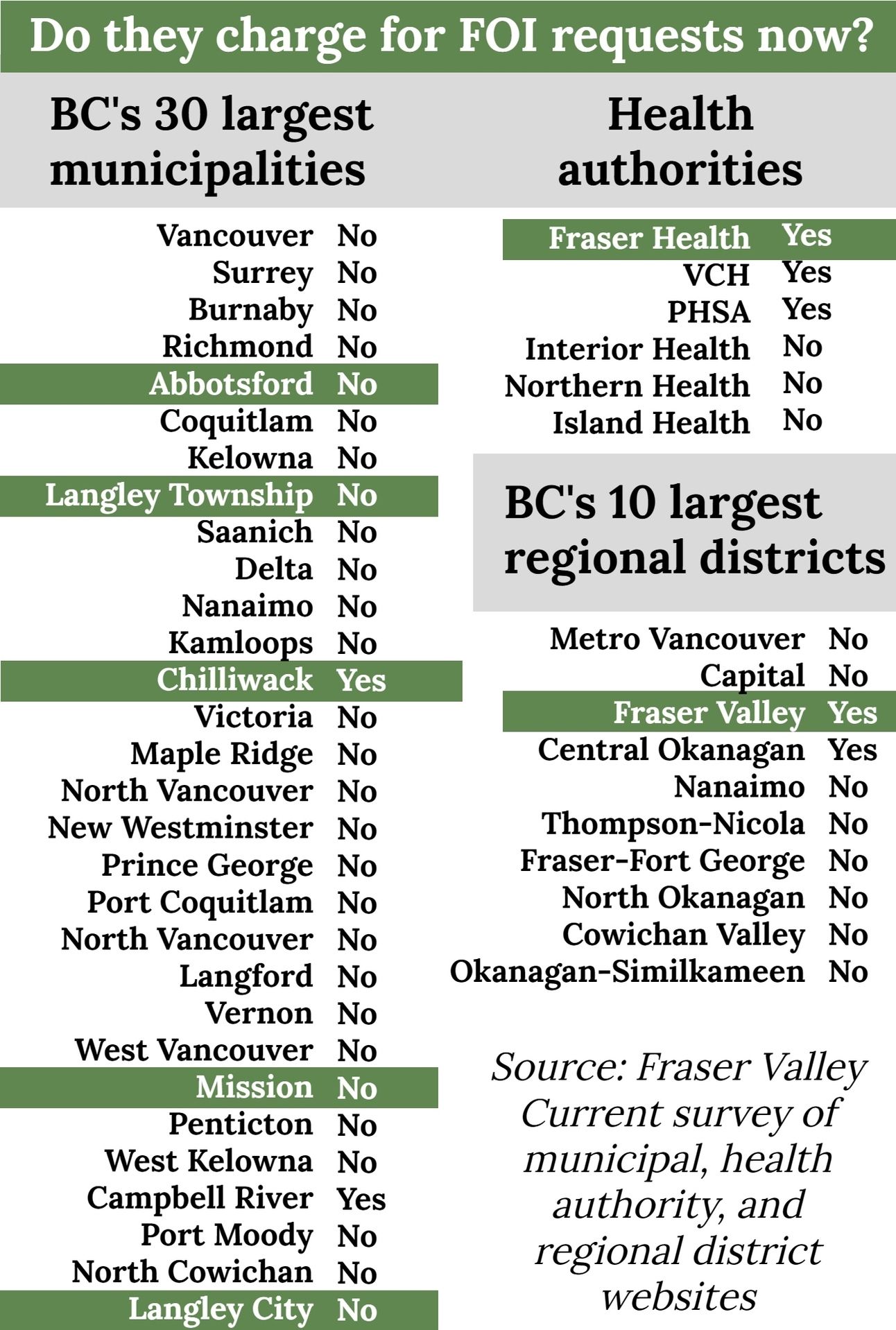 The provincewide situation makes the eastern Fraser Valley stick out like a sore thumb, where all four local governments have instituted FOI fees, as well as the Regional District.
