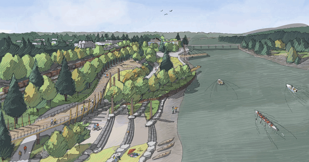 The Township of Langley’s newest Fort Langley waterfront concept envisions a public plaza, a grassy amphitheatre, natural beach area, walkways, and more. 📷 Township of Langley