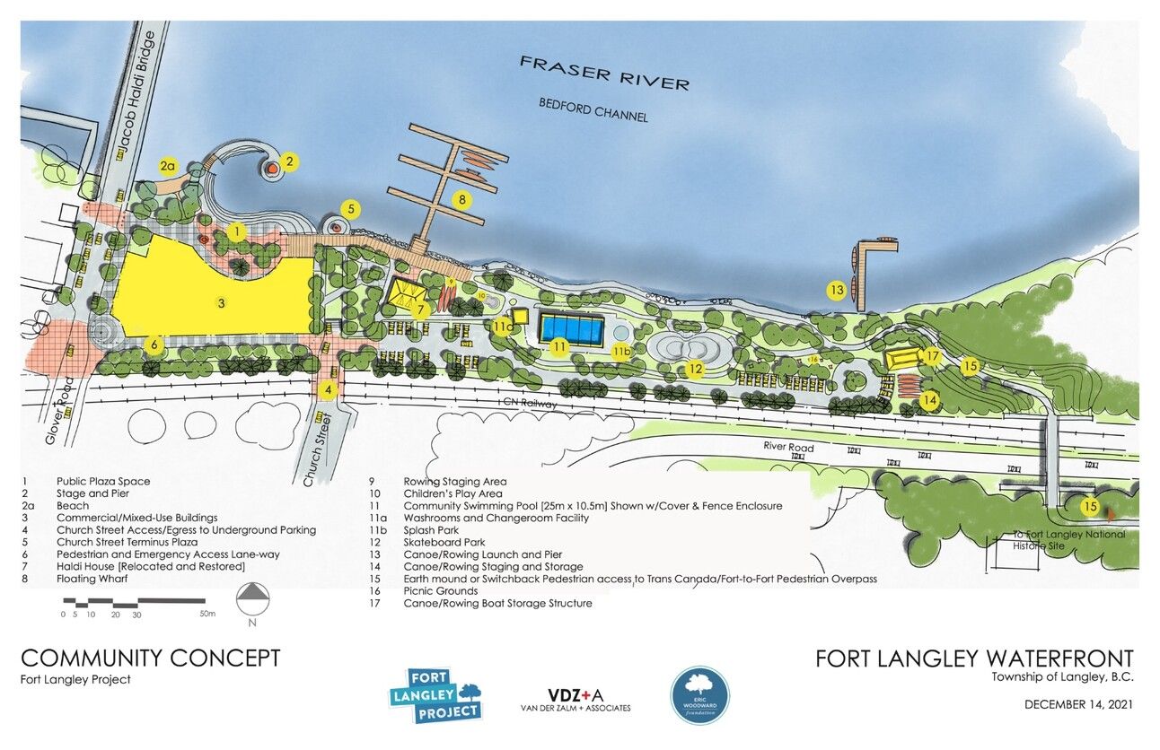 In 2021, developer and then-councillor Eric Woodward released his own design for the waterfront through his arms-length Fort Langley Project.