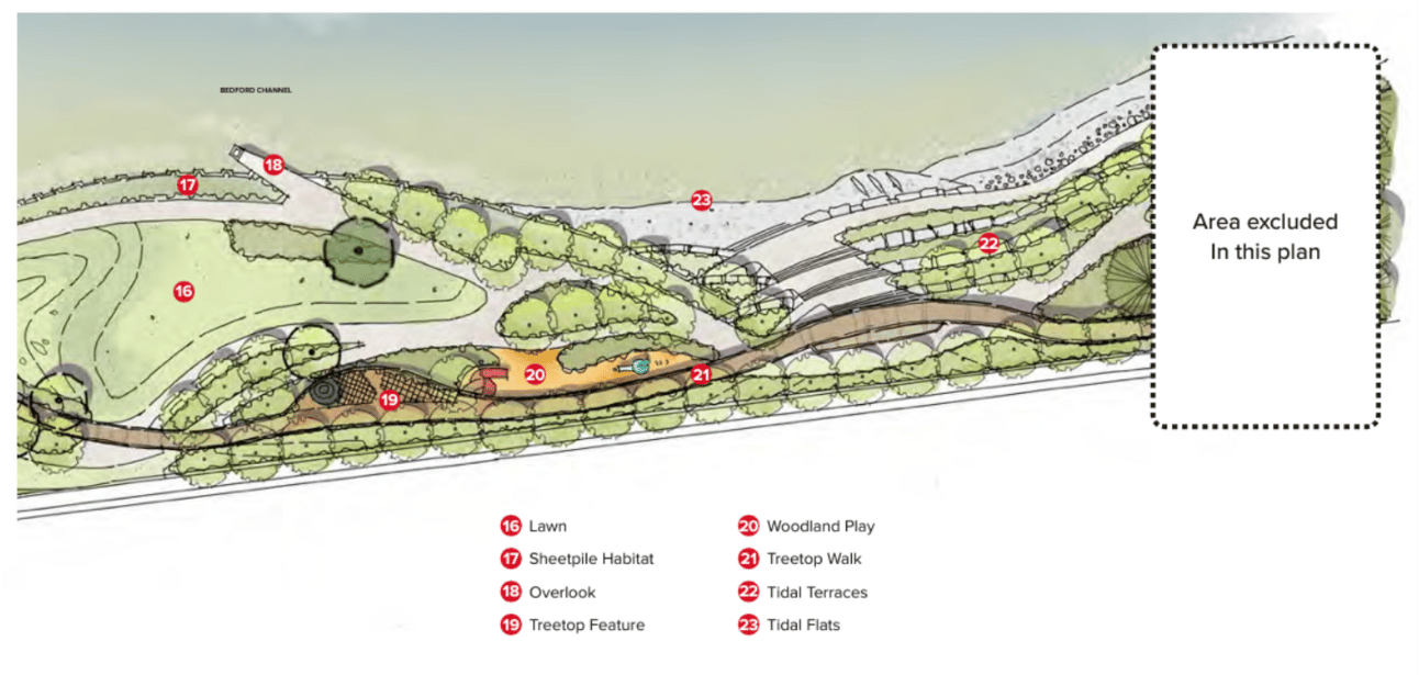 The existing docks and boat launch are included in the plan, although the Township also hopes to add a raised walkway that would extend over the river and serve as a viewpoint. New steps down to the water, and a more natural beach, could also be added.