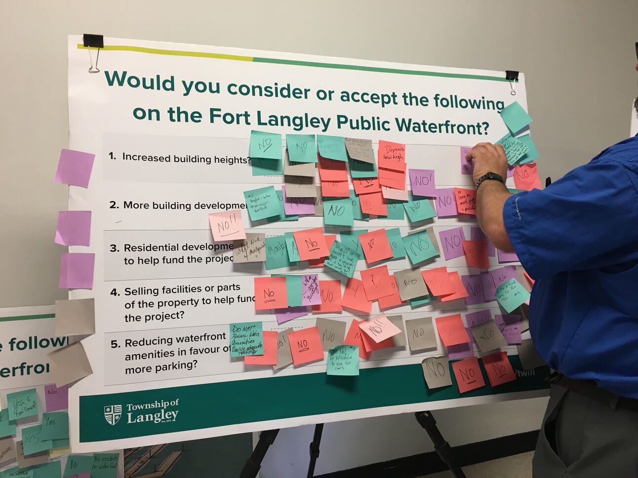 Sticky note responses to questions at the Fort Langley waterfront open house in mid-May. 📷 Contributed