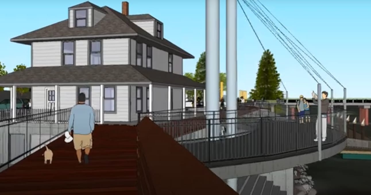 Another concept was created by the Township a decade later, after Bedford Landing had been built and that portion of the waterfront redeveloped. That concept suggested building an overpass over the railway, moving Haldi House, and creating a small floating stage. (The township created fly-over and walk-through videos to illustrate what the changes could look like.) It was part of a larger series of plans, including one to create a new museum elsewhere in Fort Langley. Although that museum, in the form of salishan Place, has been built and may open next year (The Current wrote about its opening delays in early June), the rest of the waterfront plan never did.