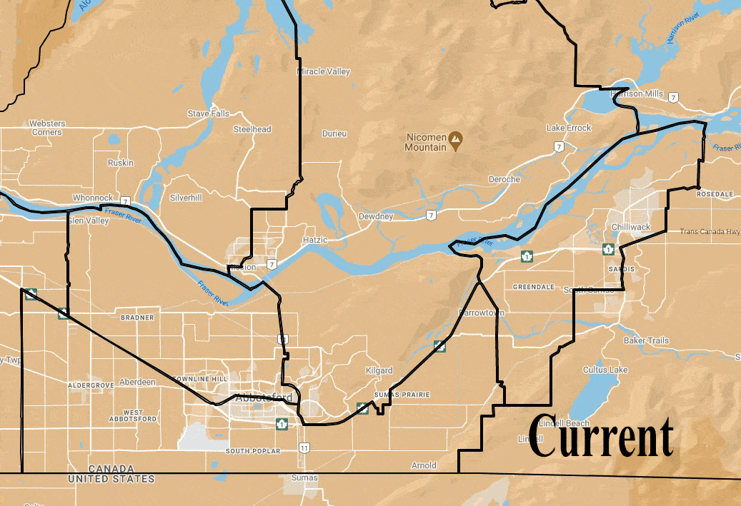 The commission fixed this by shifting the riding boundaries around. They made Abbotsford South smaller by moving Aldergrove over to Langley. They added more Mission to Abbotsford-Mission.