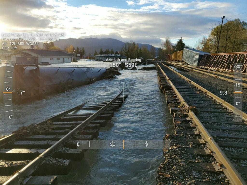 Early aerial images from the City of Abbotsford showed water reaching to the top of SRY’s diked tracks, with washouts in several spots along the line. The railway said it was “working with authorities on safely assessing the condition of the track through this region” and would develop a plan to make repairs and restore service when the evacuation order is lifted.