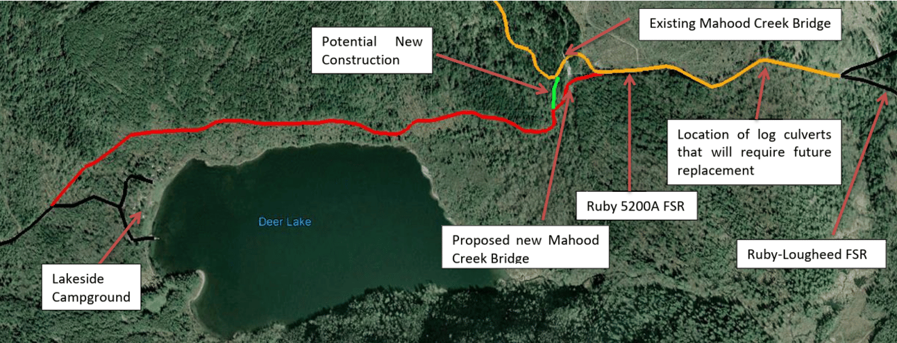 An overview of the potential evacuation route between Rockwell Drive and the Ruby-Lougheed Forest Service Road, with the needed upgrades to make the route feasible. 📷 Onsite Engineering