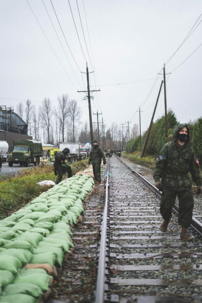 The military was deployed to the area Saturday to erect a sandbag wall in the pouring rain along the railway to prevent water from seeping across the border. Some civilians came to help: filling and carrying bags alongside the soldiers. Others set up tents and tables with coffee and snacks. So many people came out to help that the Abbotsford Police Department issued a notice asking people not to come to Huntingdon Village for sandbags, as the huge volume of people was making it challenging for materials to make it into the area.