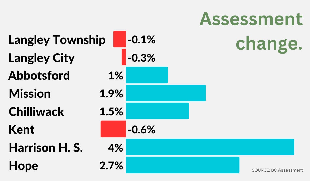 Across the region, home values were relatively stable. The assessed values of residential properties in Harrison Hot Springs, Hope, and Mission rose the most, but across the region’s largest cities, home values didn’t budge all that much.