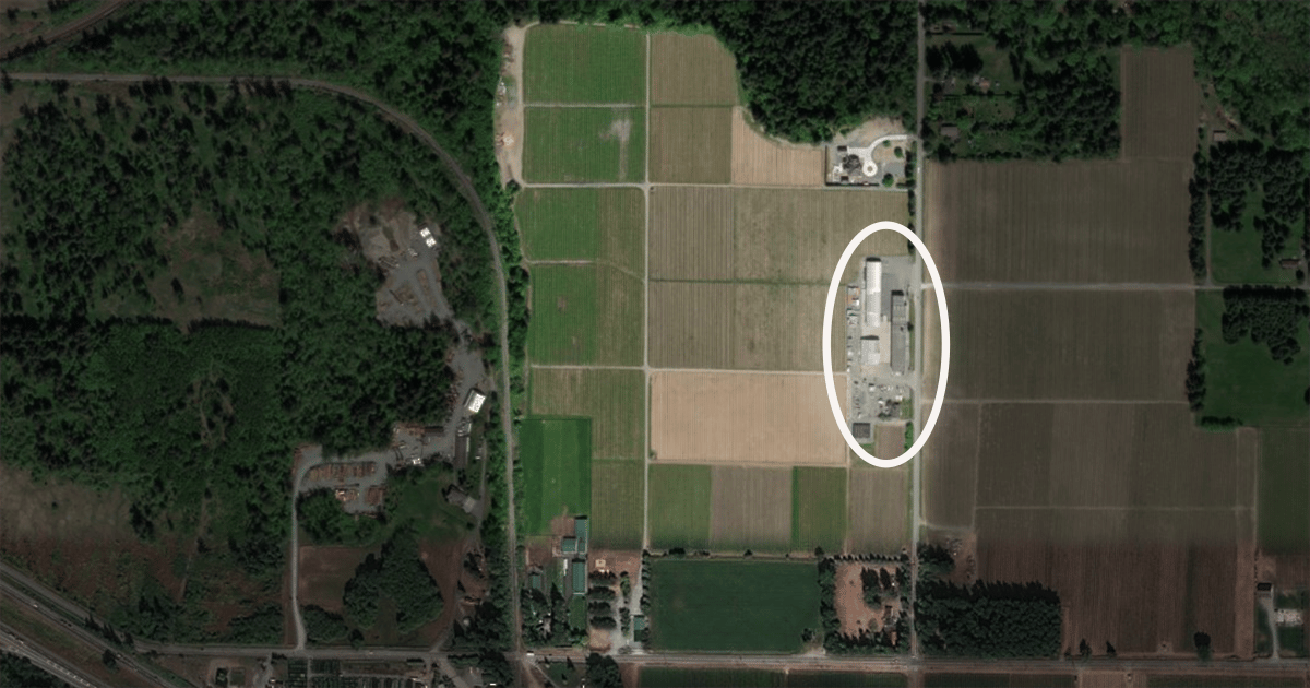 Rhonda Driediger is looking to subdivide her berry processing plant Blueridge Produce (circled) from the rest of the farm operation. 📷 Bing Maps