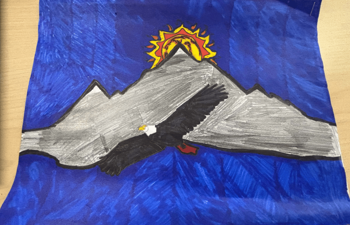 The redesigned flag is an illustration of an eagle flying across a mountain range against a blue backdrop and a vibrant sun. In a letter to Harrison council, the students say they chose the design to represent popular activities in the village, including hiking and birdwatching.