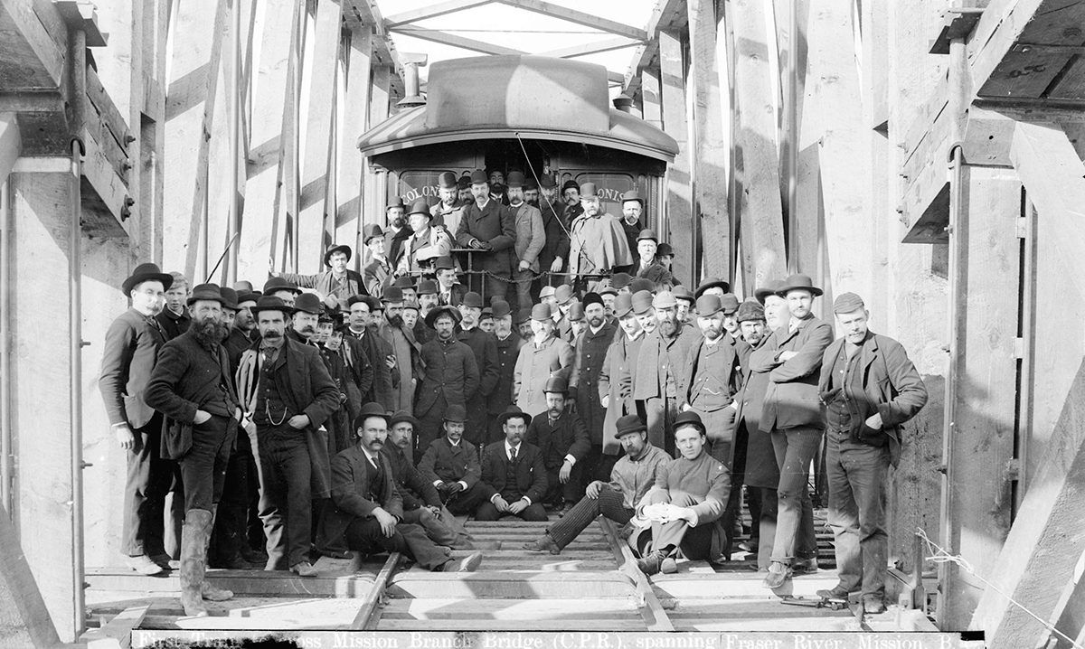 In February 1891, the first train trundled across the Mission CPR bridge over the Fraser River—and dozens of workers, politicians, and dignitaries arrived to commemorate the occasion. The bridge had been under construction by the Canadian Pacific Railway since 1889, with construction crews working sunrise to sunset. (Construction in the boggy riverbed proved a challenge: portions of the bridge had to be rebuilt daily because they would sink into the mud.)