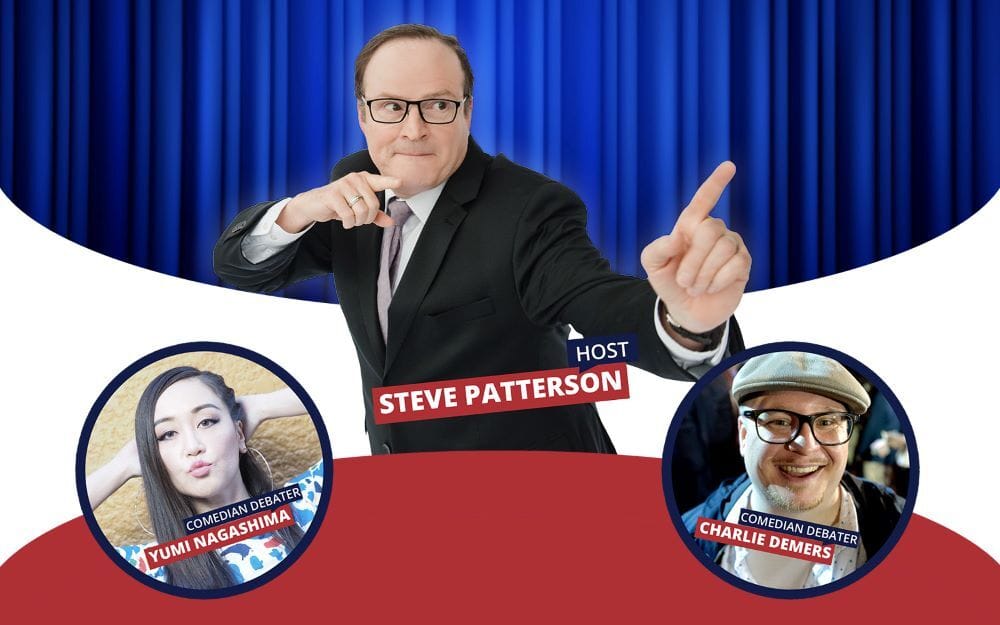 The Debaters Live on Tour is the comedy stage show where comics go toe-to-toe in a battle of laughs and logic and the audience picks the winner. Award-winning comedian and host, Steve Patterson brings two of Canada’s top headlining stand-up comics, Yumi Nagashima and Charlie Demers, across Canada to delight crowds with an exhilarating exchange of facts and funny.