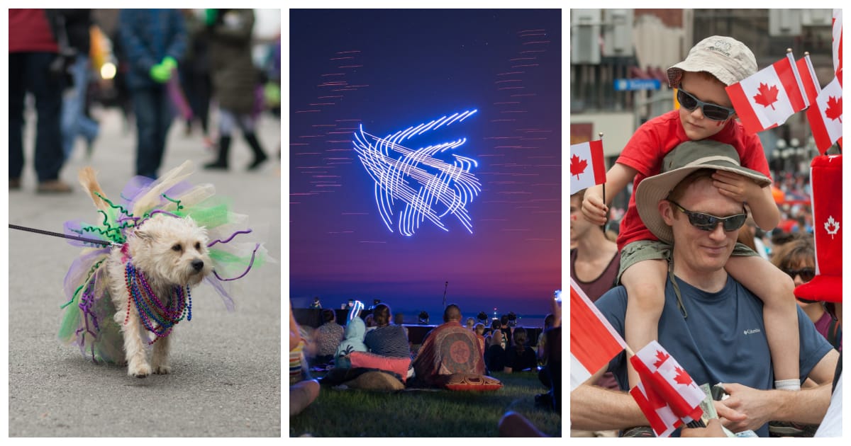 Canada Day events in the Fraser Valley this year include a pet parade in Harrison, drone shows in Langley and Chilliwack, and many other Canada-centric activities across the valley. 📷 (From left to right) Roberto Galan/Shutterstock; Vincent_Nguyen/Shutterstock; David P. Lewis/Shutterstock