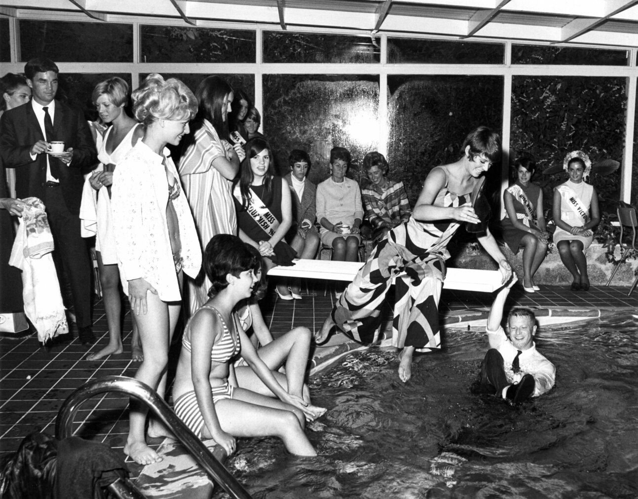 Miss PNE contestants around pool at the Miss PNE welcome banquet in 1968. That year, Linda Swanson represented Abbotsford and Powell River’s Janet Bowes took home the PNE crown. 📷 Vancouver Archives AM281-S8-: CVA 180-4722