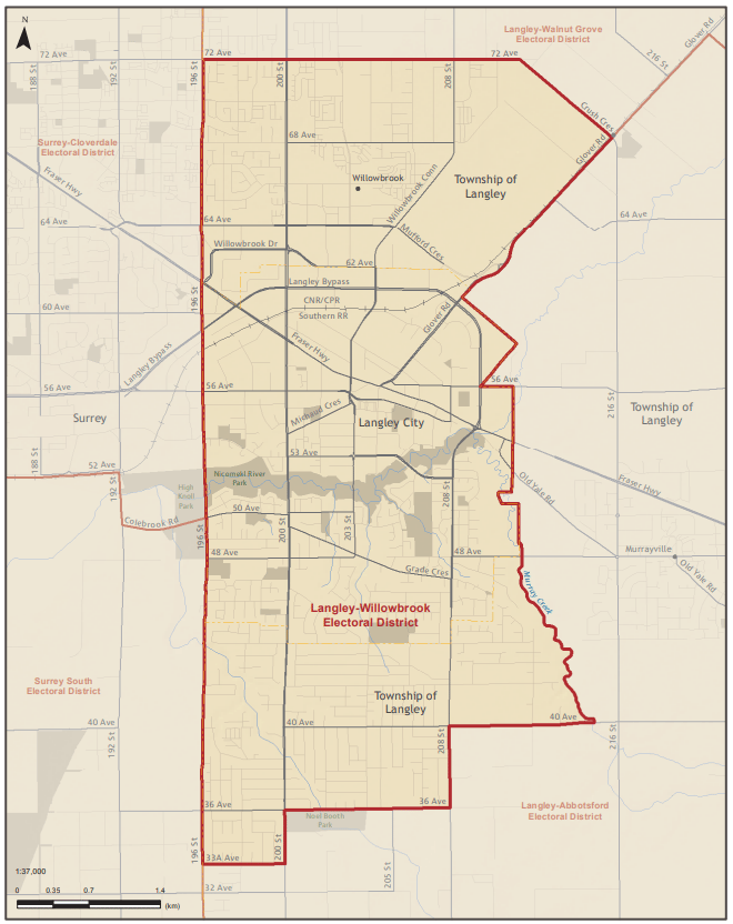 Riding: Langley-Willowbrook includes all of Langley City, the rapidly developing Willowbrook area, and the community’s more traditional South Langley neighbourhoods. The riding has the fewest farms of any Fraser Valley electoral district. Map.