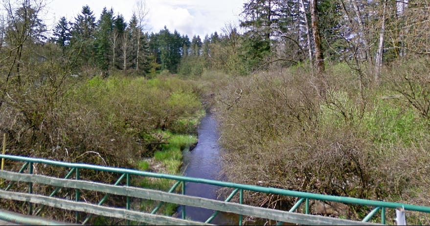 The Little Campbell River, circa April 2009, where it crosses 200th Street in Langley and heads towards the Horne Pit wetlands. 📷 Google Maps/Streetview