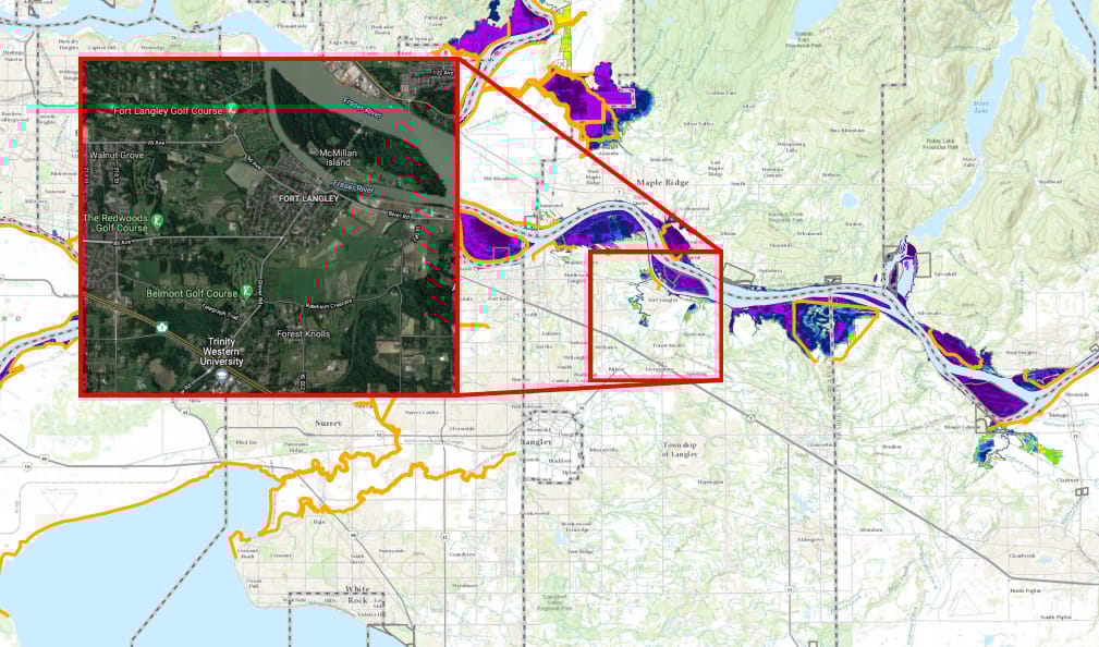 A 100-year and 200-year event would see McMillian Island submerged entirely. But inland, the overflow wouldn’t extend far beyond the banks of the Fraser. The map indicates the Fort Langley National Historic Site is likely spared.