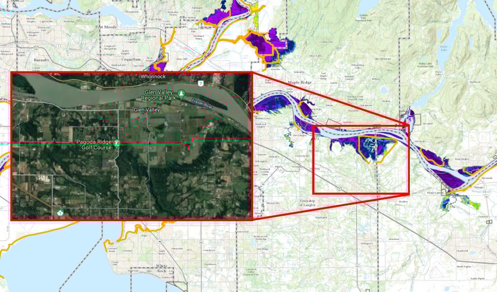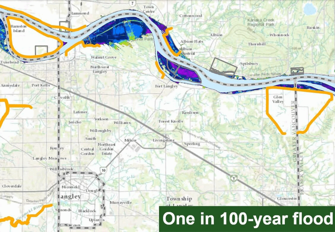 In the event of a 100-year flood, the modeling shows there are a half-dozen sizable farms and businesses at risk. The waters wouldn’t spare Glen Valley Regional Park, which could be submerged under two to three metres.