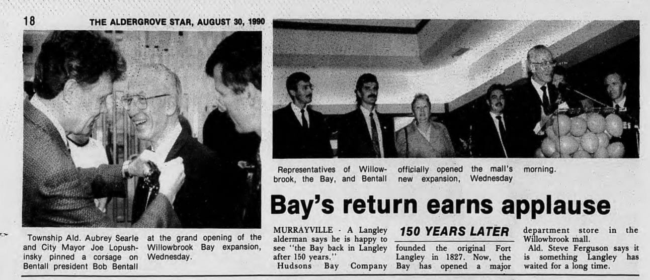 On Aug. 29, 1990, The Bay officially reopened its doors in Langley. An article in the Aldergrove Star wrote that Alderman Steve Ferguson felt it was “something Langley had waited for a long time.” (Thirty-five years later, Ferguson is still a Township councillor.)