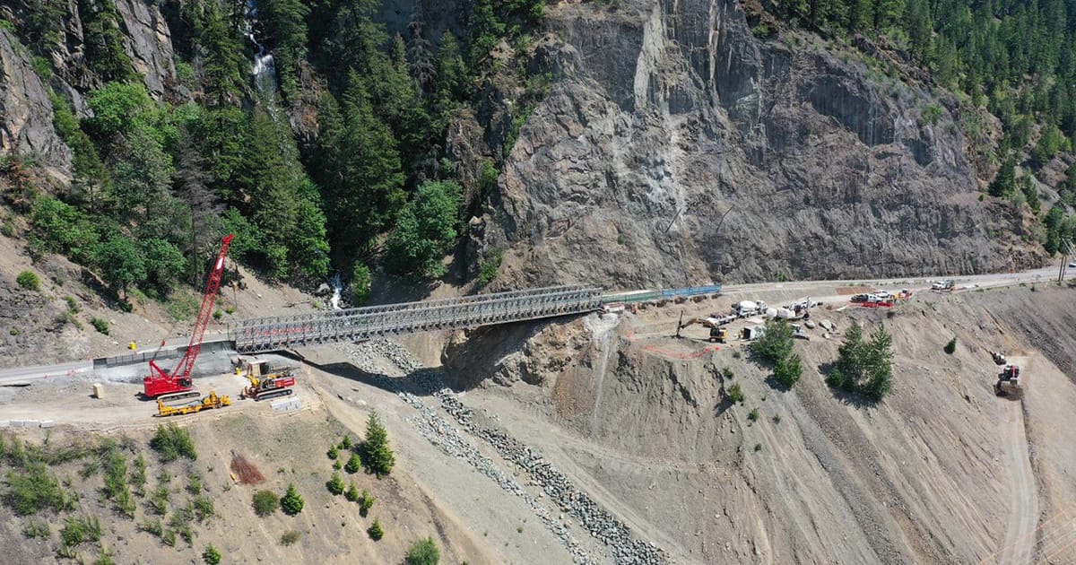 A long one-lane temporary bridge carries traffic over a stretch of Highway 1 severely damaged during the 2021 atmospheric river disaster. 📷 Ministry of Transportation