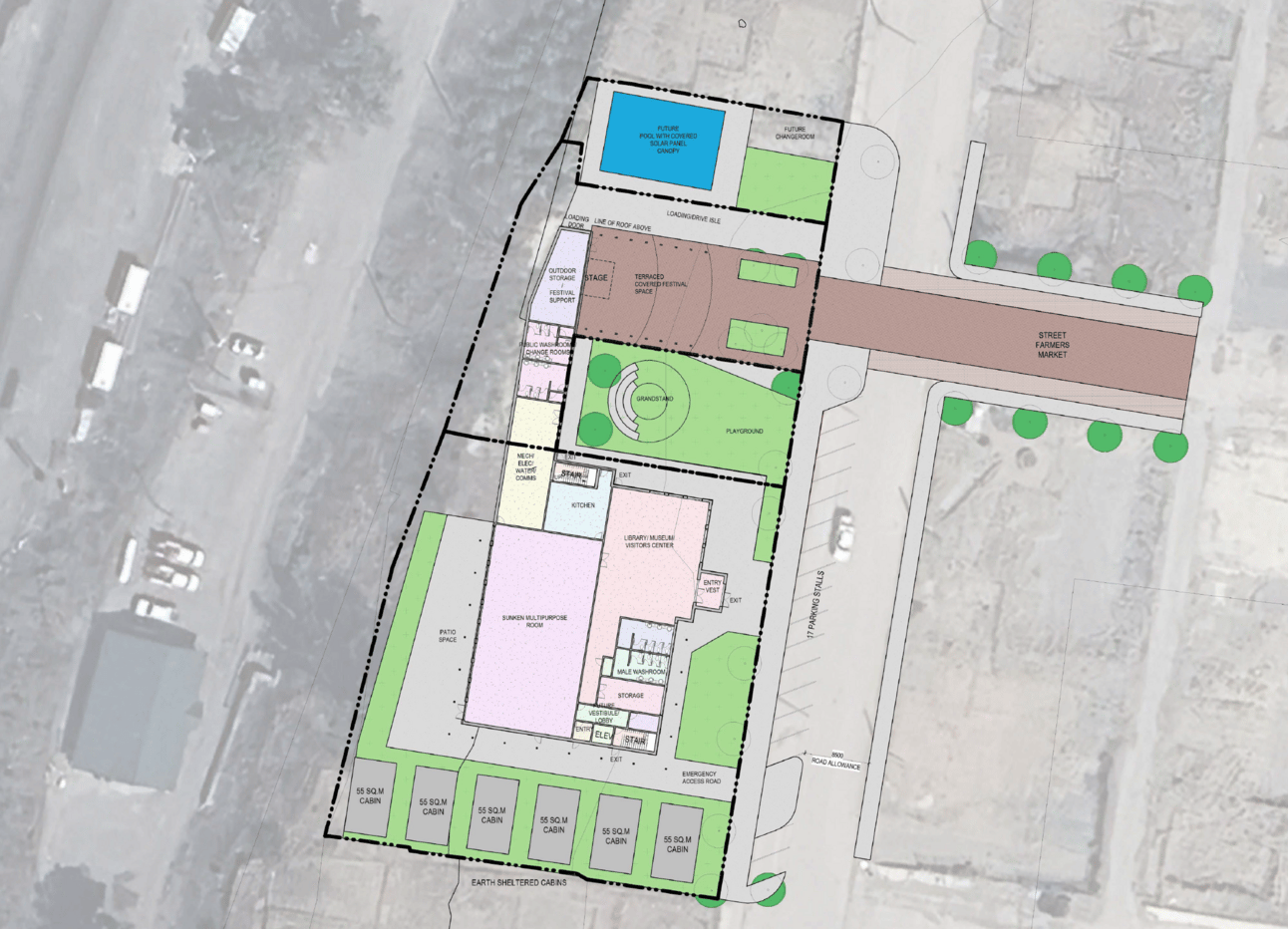 A preliminary blueprint for a proposed new community hub in Lytton envisions community spaces, a pool, and external gathering spaces. 📷 Village of Lytton