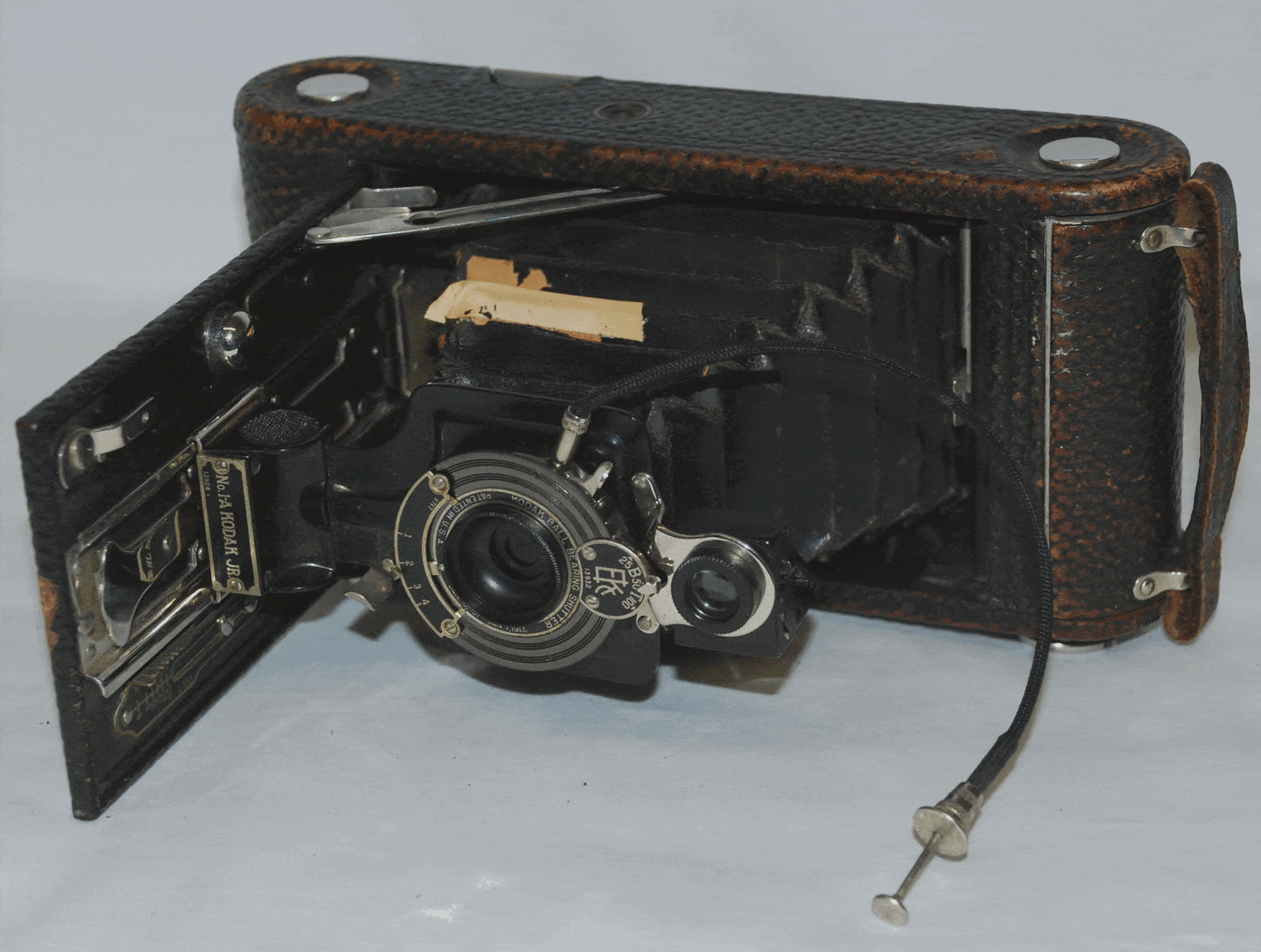 The Kodak camera was used locally from 1914, the year this model was first produced. Autographic cameras had a popular feature that allowed the photographer to write a caption directly on the film with a stylus through a small window in the back of the camera. Opening the window revealed a small strip of tissue-like carbon paper where the photographer could write a short note or description. The backing was a layer of carbon paper, facing away from the film, followed by a red tissue paper. Scribing made a clear spot in the carbon paper where the film could be exposed through the red filter with a multiple second exposure through the door. Nothing was deposited physically on the film; you just exposed the lettering.