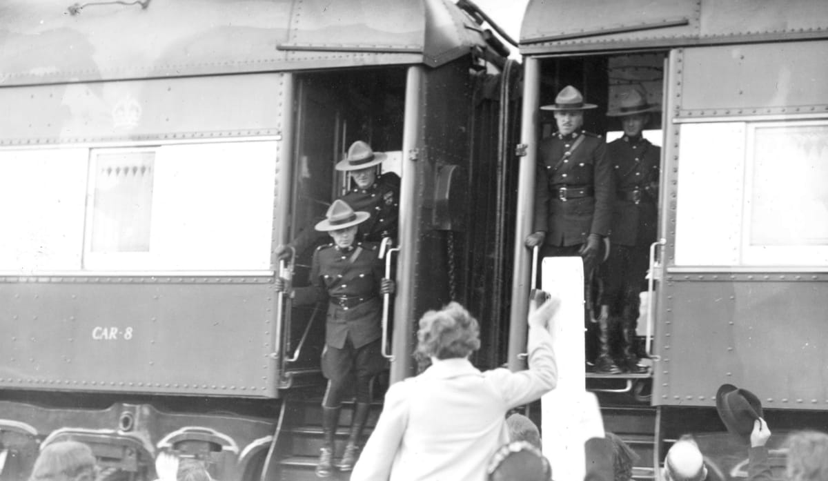 Mounties getting off a train in Fort Langley. 📷 William Orson Banfield / Vancouver Archives