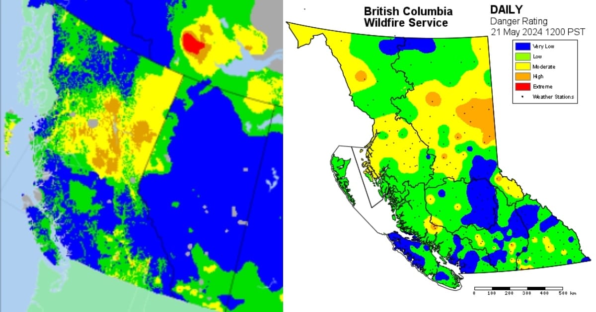 Both federal (left) and provincial (right) wildfire maps currently show a low fire danger rating for southwestern BC. šŗ BC Government/Government of Canada