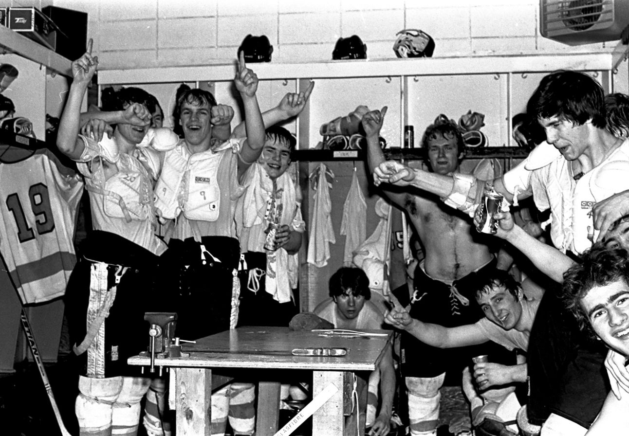 The Abbotsford Flyers celebrate a 1977 win. š· The Reach Gallery Archives/P23426