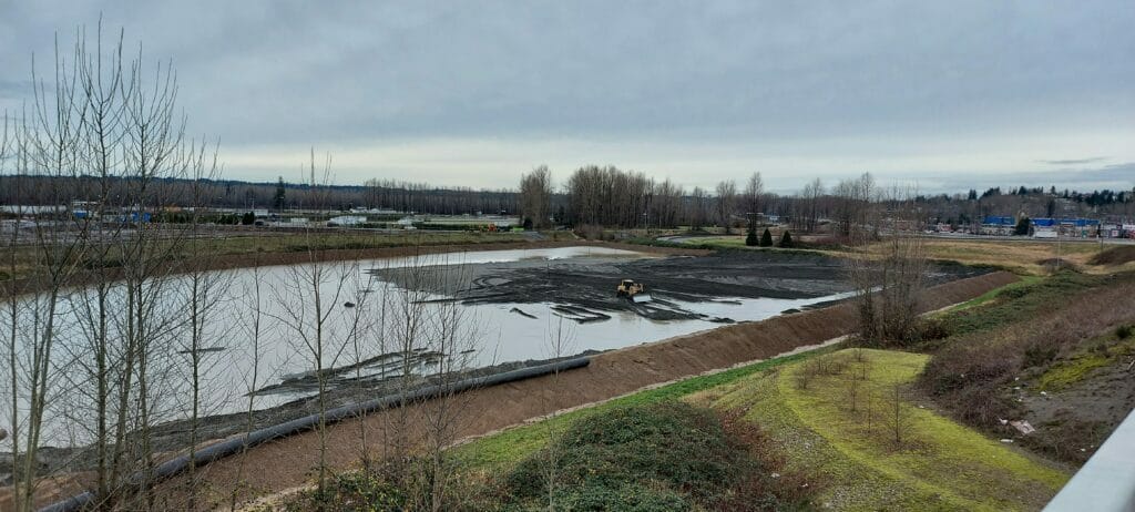 The first stage of the project is already underway. Crews are now dredging the Fraser River as part of a massive project to install a new sewer pipe between Abbotsford and Mission. Material that is removed from the river is being methodically placed west of the CPR bridge to raise the land there.