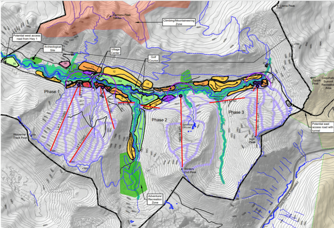 A tentative land-use plan for the proposed resort envisions multiple ski lifts, a golf course, and space for thousands of new homes. 🗺 Spuzzum First Nation
