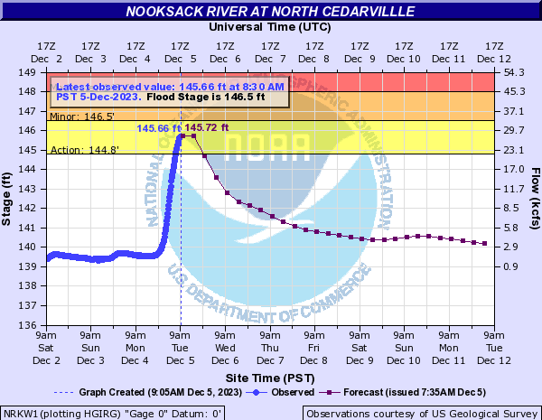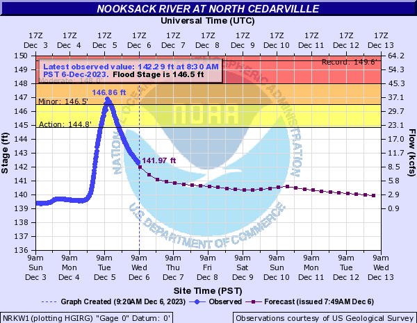The graph in question is a measure of the height of the Nooksack River at a place called North Cedarville, just upstream of Everson, Wash., the location where the Nooksack escapes its basin and floods into Canada during particularly high-water events.