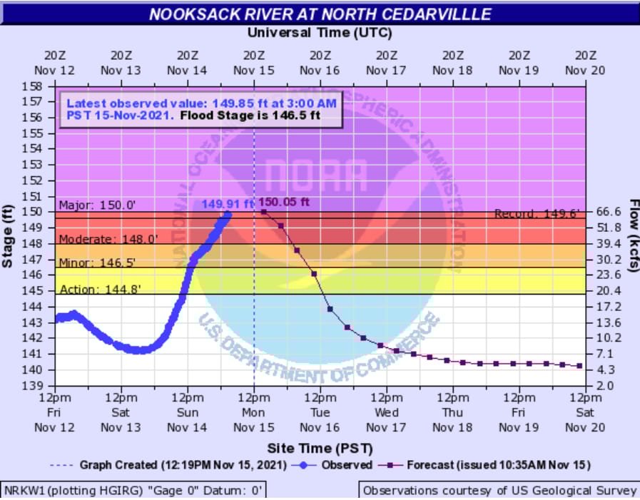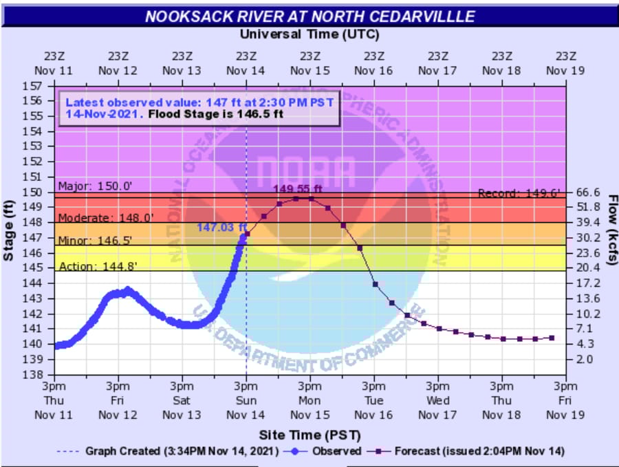 As you watch the chart, you should be monitoring other channels. The chart is useful, but you aren’t a river expert. Of all the organizations in the region, the people and local government in Sumas, Wash., has the best track record in delivering reliable and timely preparation information. That community has the most experience with the Nooksack and its Facebook page is usually a good indication of how seriously officials there are taking the threat. In 2021, the folks there were filling sandbags days before the Nooksack even began to rise. But also remember that Sumas can sustain significant damage without Sumas Prairie taking a large hit. So even when they are reporting considerable damage, it’s possible that a flood may leave Canada mostly unscathed.