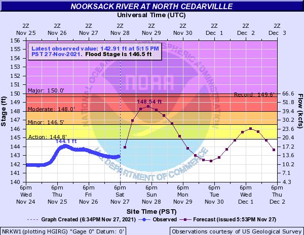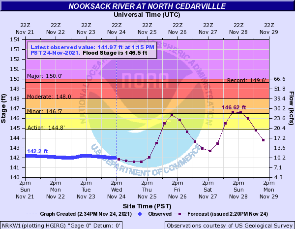 The initial storm that caused the 2021 flood involved incredible amounts of rain. If you look at the forecast and see predicted rainfall totals under 100mm for Chilliwack or Abbotsford, the odds of a major Nooksack flood are relatively low. (Though the saturation level of the ground, the temperature on Mt. Baker, pre-existing river levels from other recent storms can also play a large impact. That’s one reason why the chart is very useful.)