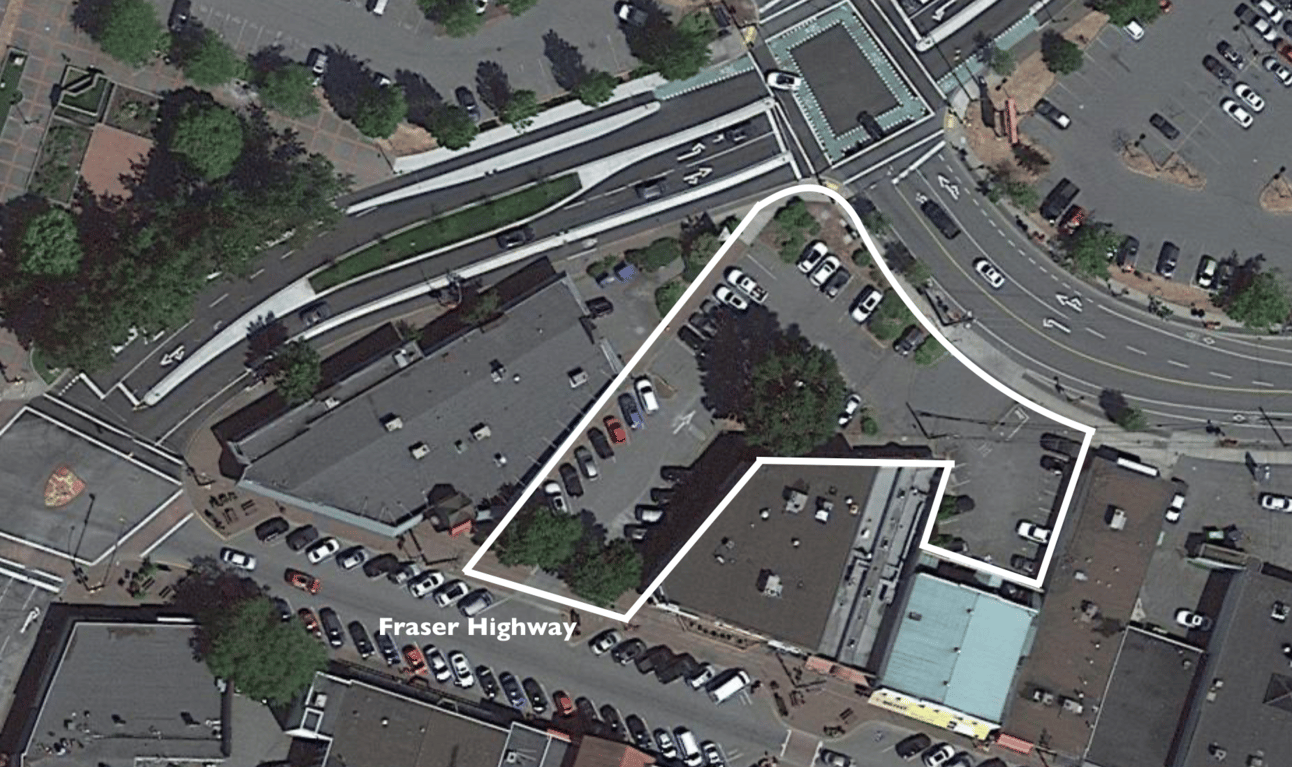A portion of the Fraser Highway currently used as a parking lot will be sold and, eventually, redeveloped. 📷 Google Maps