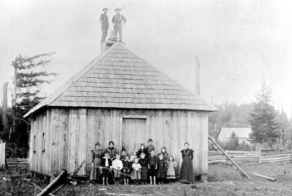 Building schools was a much simpler process in the early days of the province—but the schools themselves were a lot simpler, too. Pictured above is the first Peardonville School in 1897, one year after it opened. The school was small and rebuilt only 10 years later into a larger one-room schoolhouse. The funding for the construction came mostly from fundraising dances and concerts held by the community.