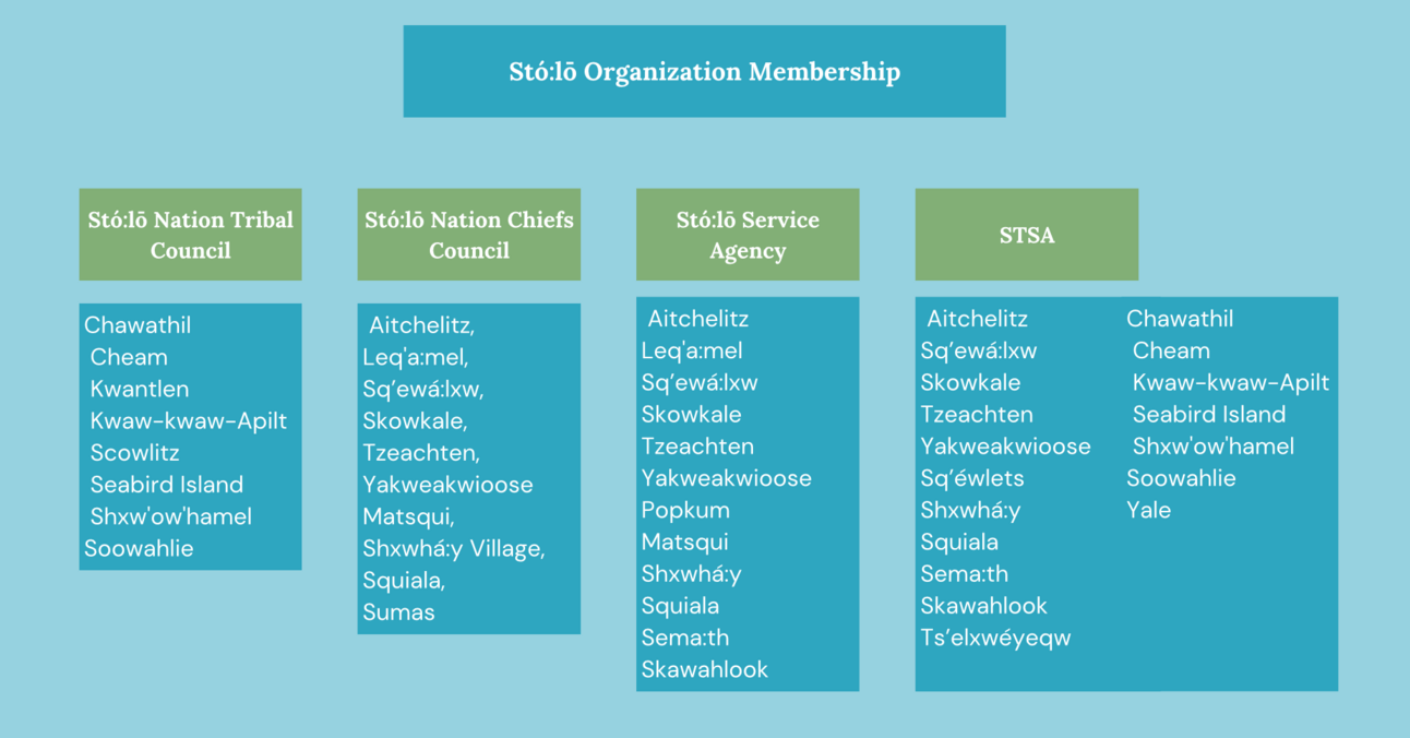 The Stó:lō Service Agency’s membership is slightly wider than the political arm of Stó:lō Nation. Popkum and Skawahlook First Nations are also part of the agency’s membership, although they are not part of the Stó:lō Chief’s Council.