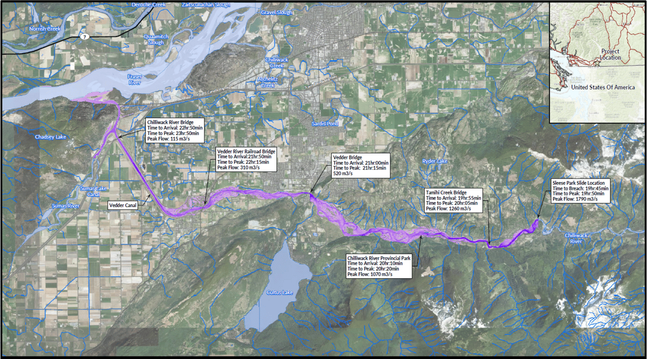 New modelling considers what would happen if a landslide blocks the Chilliwack Rier for a prolonged period. 🗺 FVRD/BC Government